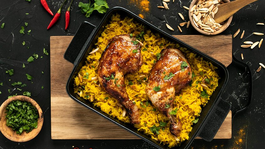 Asiatische Pouletschenkel mit Kurkuma-Mandel-Reis