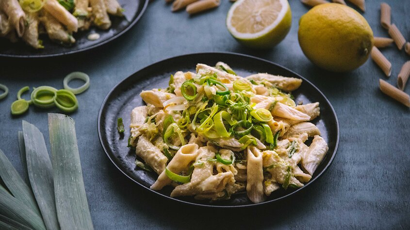 - Den Lauch und die Zwiebel der Sauce beifügen, diese abschmecken und über die Penne geben.