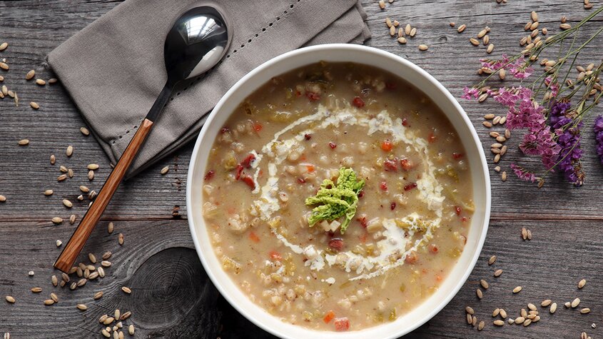 - Hitze reduzieren und die Suppe während 45–55 Minuten köcheln lassen (bis die Gerste durch ist, aber noch Biss hat).