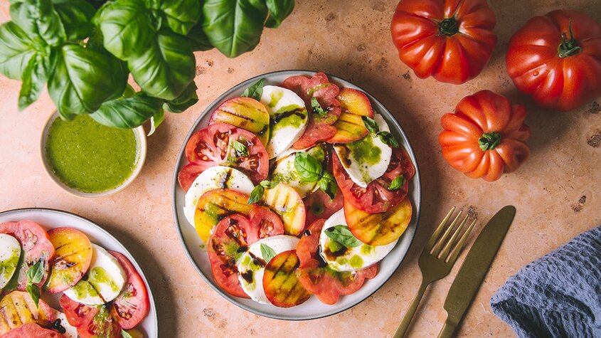 Caprese-Salat mit grillierten Nektarinen an Basilikum-Orangen-Dressing