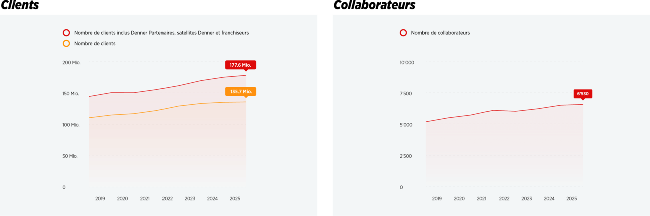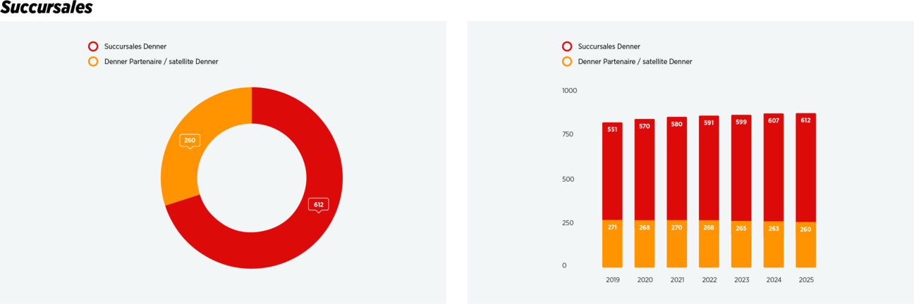 Denner - c’est l'approvisionneur de proximité à prix discount. Avec 872 magasins répartis dans toute la Suisse, nous sommes toujours proches de notre clientèle. Plus de 6'530 collaborateurs et détaillants indépendants (partenaires de Denner) fournissent jour après jour une contribution impressionnante, qui influe de manière décisive sur le succès de l'entreprise. Ensemble, nous croissons et façonnons activement le présent et l'avenir de Denner. Les faits et les chiffres le prouvent.