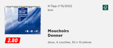La qualité ne doit pas forcément être chère. C'est aussi ce que confirment régulièrement les tests comparatifs - et vous donnent par la même occasion de précieuses informations pour vous orienter parmi la ribambelle de produits sur le marché. Les produits Denner obtiennent régulièrement d'excellents résultats, par exemple lors de tests effectués par K-Tipp, Saldo, Kassensturz ou d'autres - une confirmation que vous avez choisi le bon détaillant.